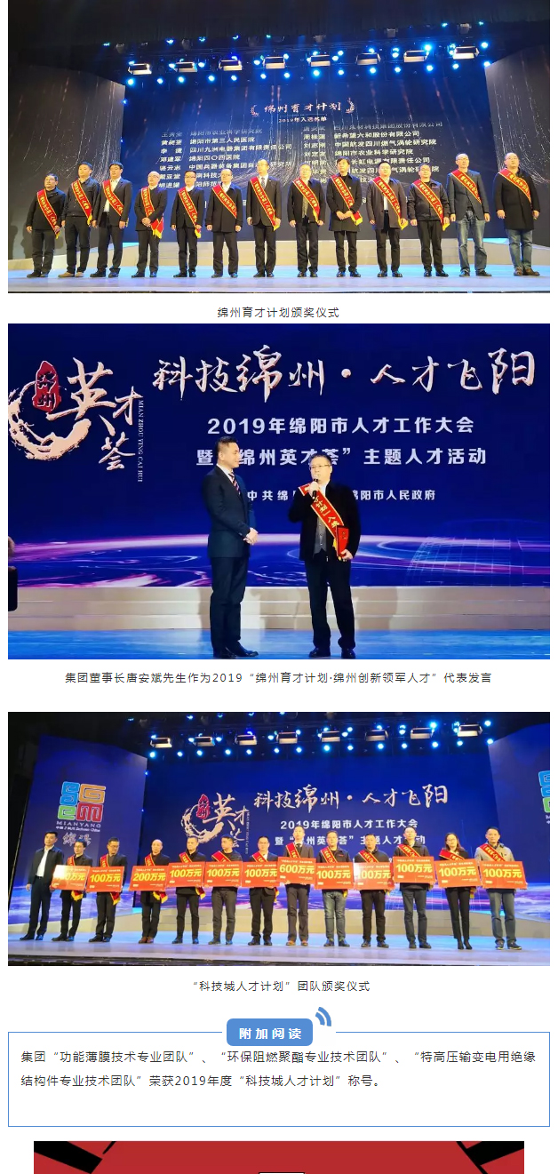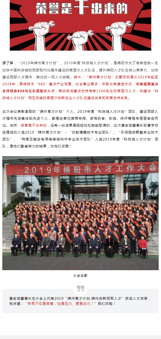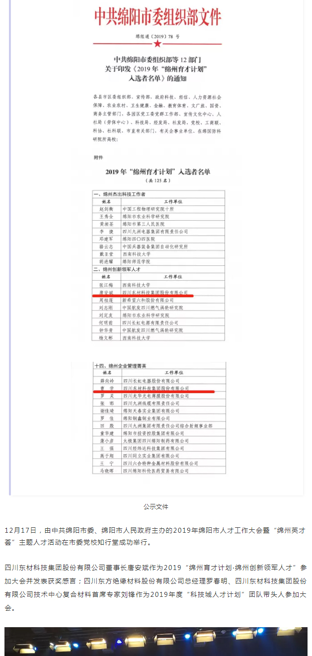 12月10日,綿陽(yáng)市市委組織部等12部門(mén)聯(lián)合發(fā)布《關(guān)于印發(fā)2019年“綿州育才計(jì)劃”入選者名單的通知》(綿組通〔2019〕78號(hào)),公示了14類(lèi)125名入選者名單,公司董事長(zhǎng)唐安斌成功入選2019“綿州育才計(jì)劃·綿州創(chuàng)新領(lǐng)軍人才”, 總經(jīng)理曹學(xué)成功入選2019年“綿州育才計(jì)劃·綿州企業(yè)管理菁英”。